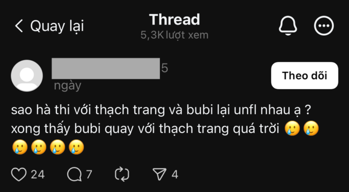 Mở đầu chuỗi drama là tin đồn về mối quan hệ xoay quanh Thạch Trang (Thạch Nguyễn Phương Trang, sinh năm 1998). Nhiều người thắc mắc khi Hà Thi bất ngờ hủy theo dõi Thạch Trang và BUBI Tran trên Instagram, dù trước đó cả ba vẫn thân thiết và chung sự kiện.